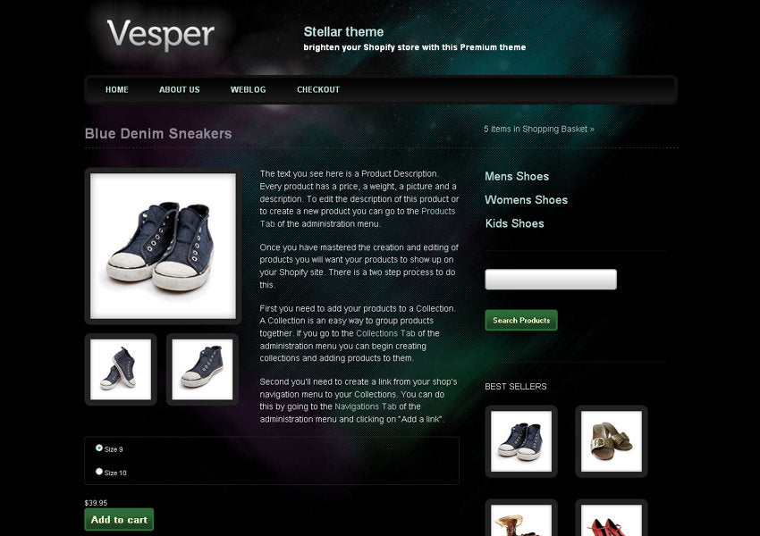 Vesper is a simple and clean theme with just the right amount of features! It can easily be customized to use your own logo, change the background image and brand colors, display payment icons, style buttons or borders and more.